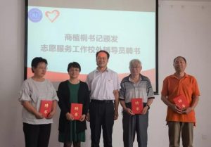 商植桐书记向天津市志愿服务联合会劳动模范分会、海河之滨支边助学携手小分队到场嘉宾颁发志愿服务工作校外辅导员聘书,希望老前辈的光和热深切影响、感化我们的新一代大学生。