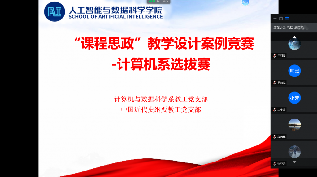 为落实“立德树人”根本任务,实施“铸魂育人”工程,提升教师课程思政建设的意识和能力,不断优化课程思政案例设计,切实把思想政治工作贯穿教育教学全过程,6月26日—29日,网赌app 与马克思主义网赌app 十个“结对共建”的教师党支部开展了线上“课程思政+思政课程”集体备课暨思政课教师指导专业课教师优化课程思政案例设计的教学研讨活动,网赌app 领导班子成员深入各教学部门参加活动。联系计算机与数据科学系教师党支部的校党委常委、副校长段国林参加了本次活动并予以指导。